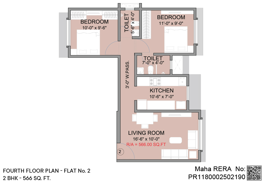2 BHK | Area - 566 - Sq.ft